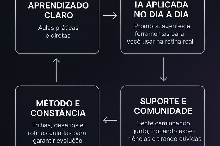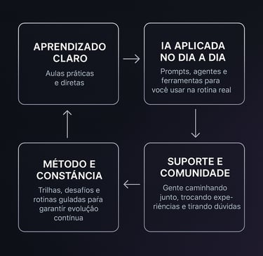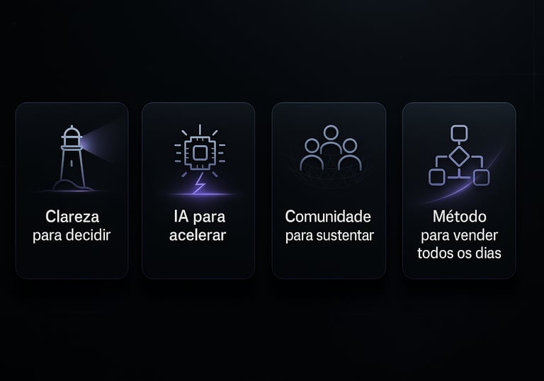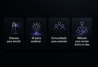 Aqui você não aprende só ferramentas. Você aprende estratégia, clareza e execução e usa IA como aceleradora de resultados.